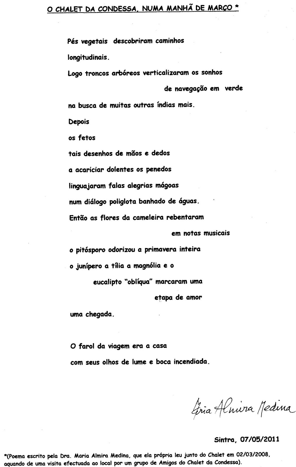Estão muito enganados se, desconhecendo o calibre de animadora de Emília Reis, tiveram a ousadia de imaginar que se limitaria a conduzir aquela meia centena de curiosos visitantes até ao Chalet e jardins adjacentes, proferindo umas palavras de circunstância, à laia de cicerone contratado para o efeito. Pois, não senhores. Como bem atestam as provas apensas, os textos e as imagens que distribuiu, contradizem qualquer solução de facilidade, significando uma cuidadosa preparação. que foi ao ponto de avançar com dois inéditos.